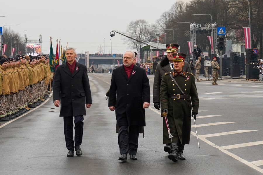 Latvian President Egils Levits (C, front) inspects the Independence Day military parade in Riga, Latvia. (Photo by Janis/Xinhua)■