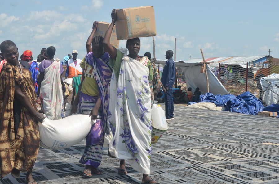 Internally Displaced Persons (IDPs) carried food rations donated by the World Food Program (WFP) at the Malakal Protection of Civilians site in Malakal, South Sudan, June 19, 2019. (Xinhua/Denis Elamu)