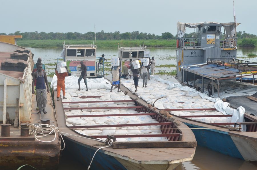 Humanitarian workers loaded relief food and other items on the World Food Program barges in Malakal port in Malakal, South Sudan, June 20, 2019. (Xinhua/Denis Elamu)