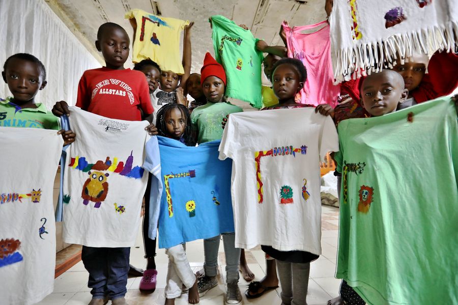 Children show graffiti artworks at the Emmanuel New Hope Orphanage, in Nairobi, capital of Kenya, Nov. 19, 2019. (Xinhua/Wang Teng)