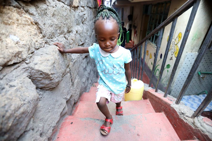 A child climbs the stairs at the Emmanuel New Hope Orphanage, in Nairobi, capital of Kenya, Nov. 19, 2019. (Xinhua/Wang Teng)