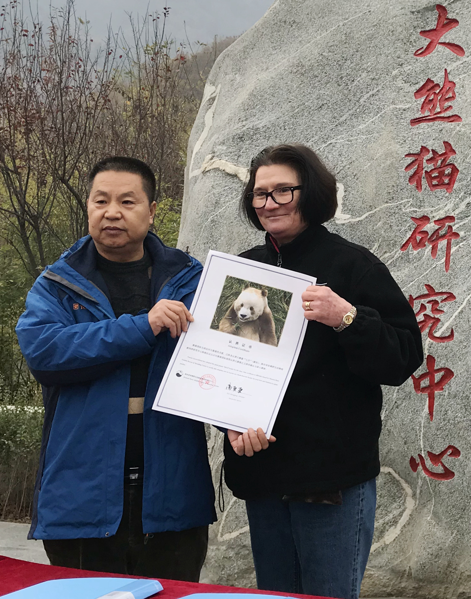 Gao Genggeng (L), vice director of the Qinling research center of giant panda breeding, and Suzanne Braden, responsible person of Pandas International, present the adoption agreement in Xi'an, northwest China's Shaanxi Province, Nov. 20, 2019. (Photo provided to Xinhua)