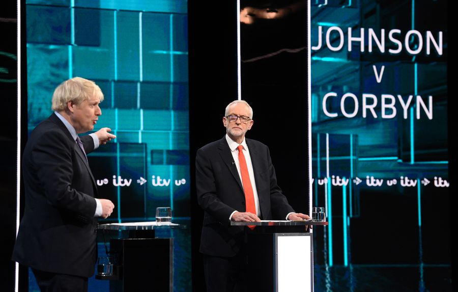 In this handout image provided by ITV, British Prime Minister Boris Johnson (L) and British Labour Party leader Jeremy Corbyn react during their election head-to-head debate live on ITV in Salford, Britain, Nov. 19, 2019.(Jonathan Hordle/ITV/Handout via Xinhua)