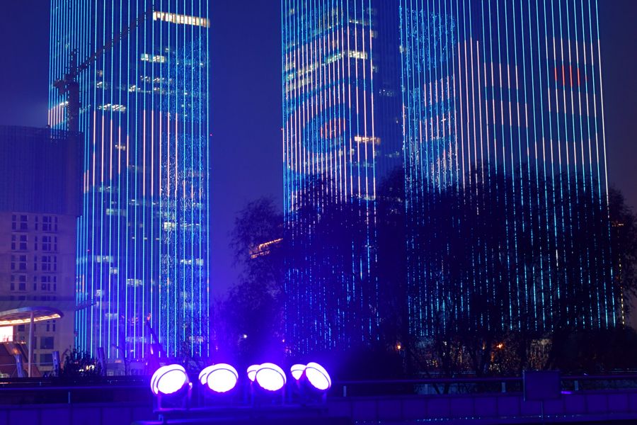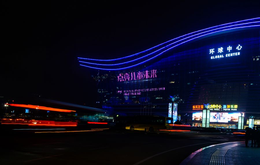 The Global Center exhibits blue lighting to mark World Children's Day 2019 in Chengdu, southwest China's Sichuan Province, Nov. 20, 2019. (Xinhua/Tang Wenhao)