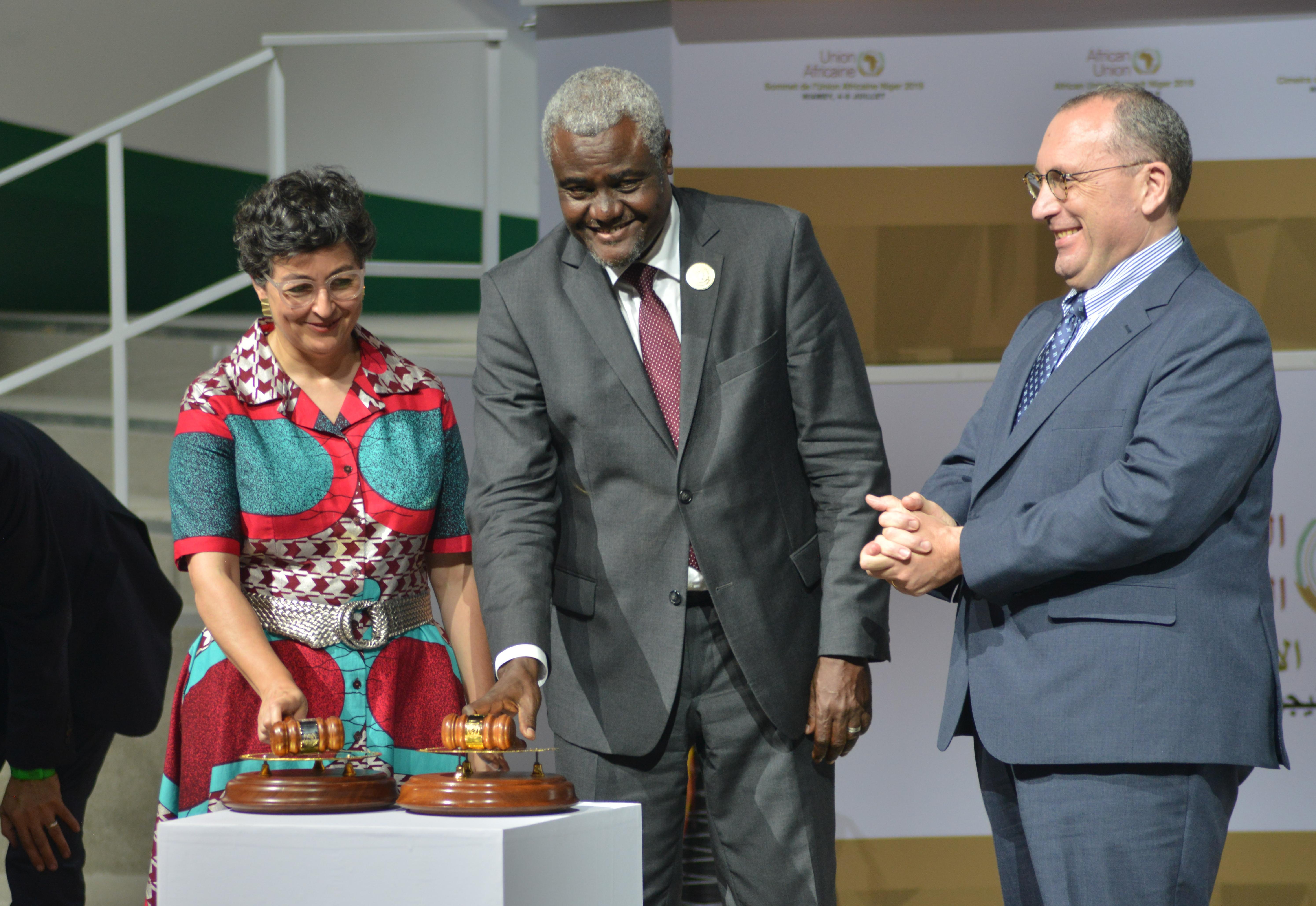 Chairman of the African Union (AU) Commission Moussa Faki Mahamat (C) announces the operational phase of the African Continental Free Trade Area (AfCFTA) Agreement during the launching ceremony in Niamey, capital of Niger, July 7, 2019. (Str/Xinhua)