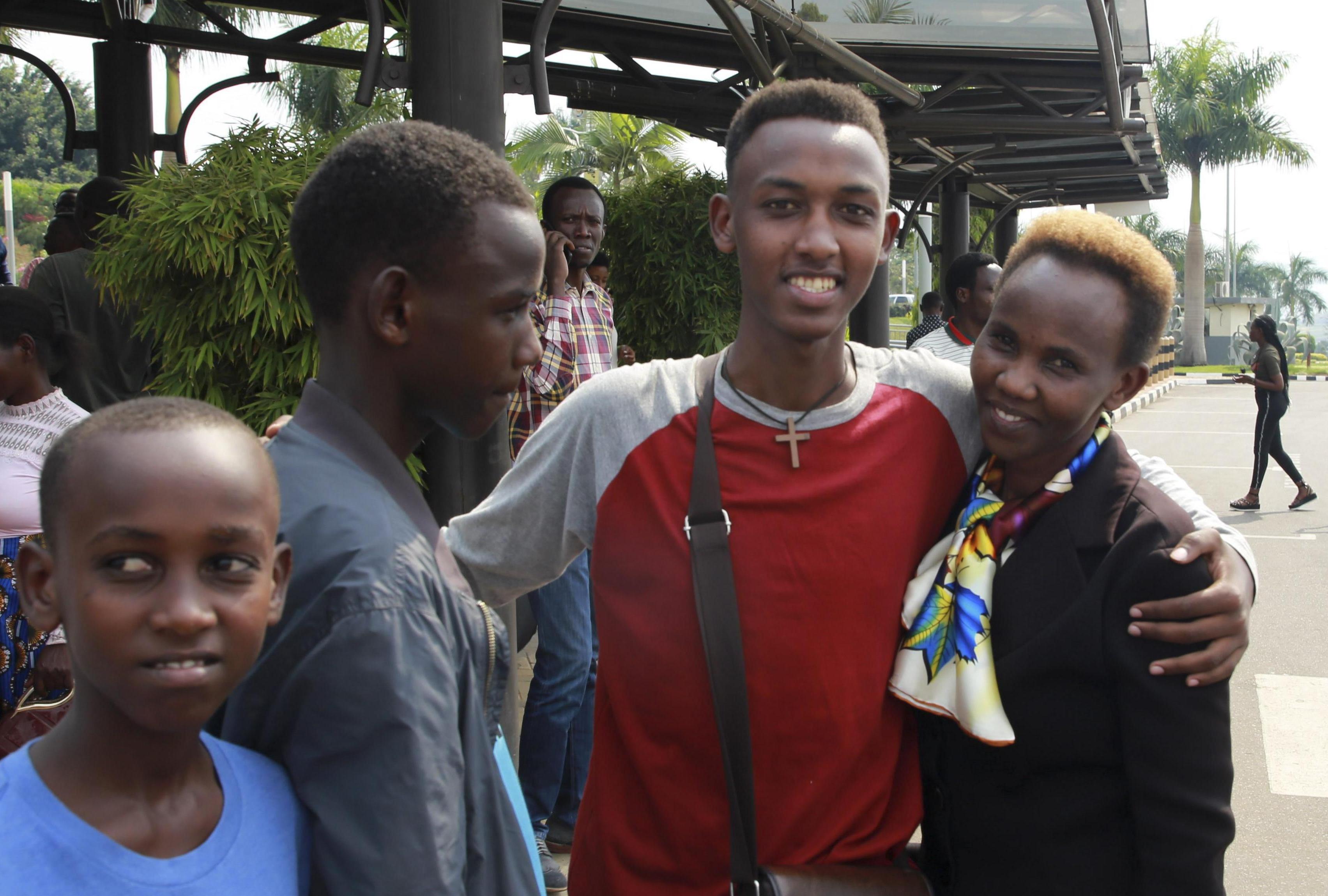 Mike Manzi (C), a Rwandan student, bids farewell to his family and friends before departing for China to attend an undergraduate program at the Alibaba Business School at Kigali International Airport in Kigali, Rwanda, on Sept. 9, 2019. (Xinhua/Lyu Tianran)