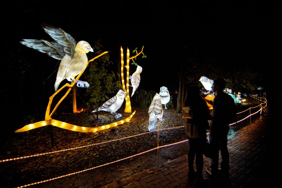 The park is illuminated by 470 lanterns shaped like animals and plants, including tropical birds with two-meter-long wingspans, pumas peering down from treetops, and a giant Chinese dragon floating over the garden's central lake.
