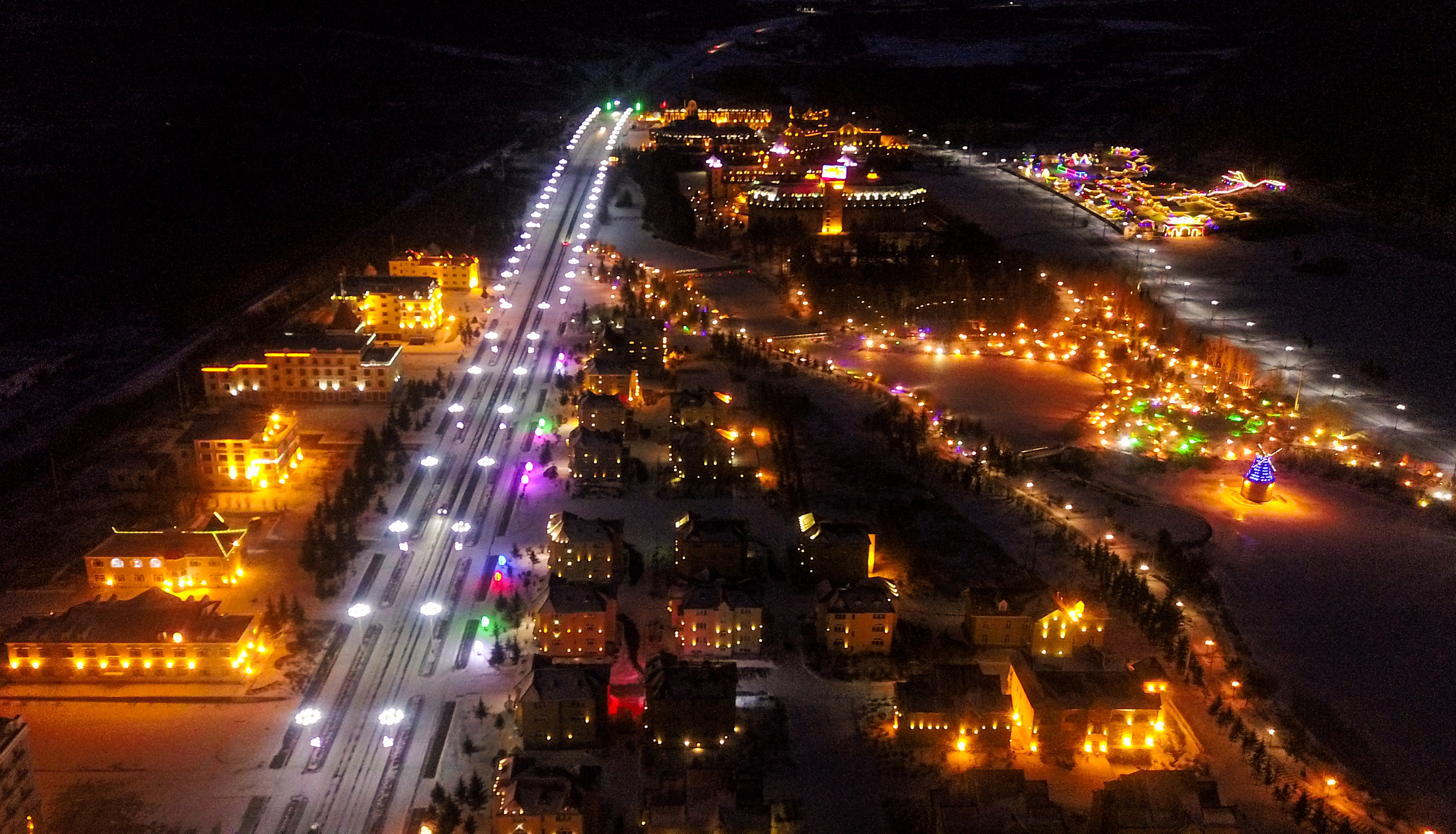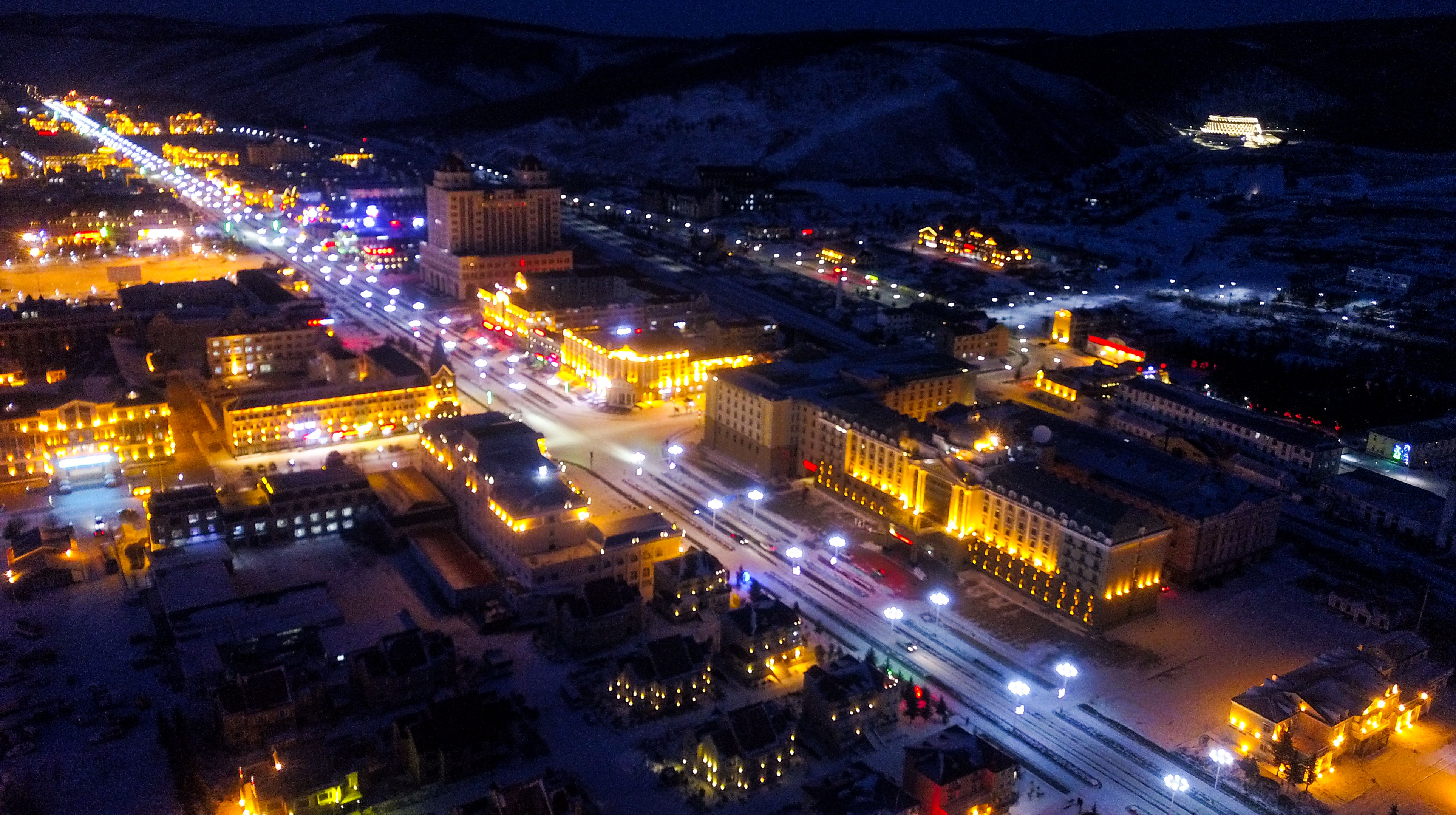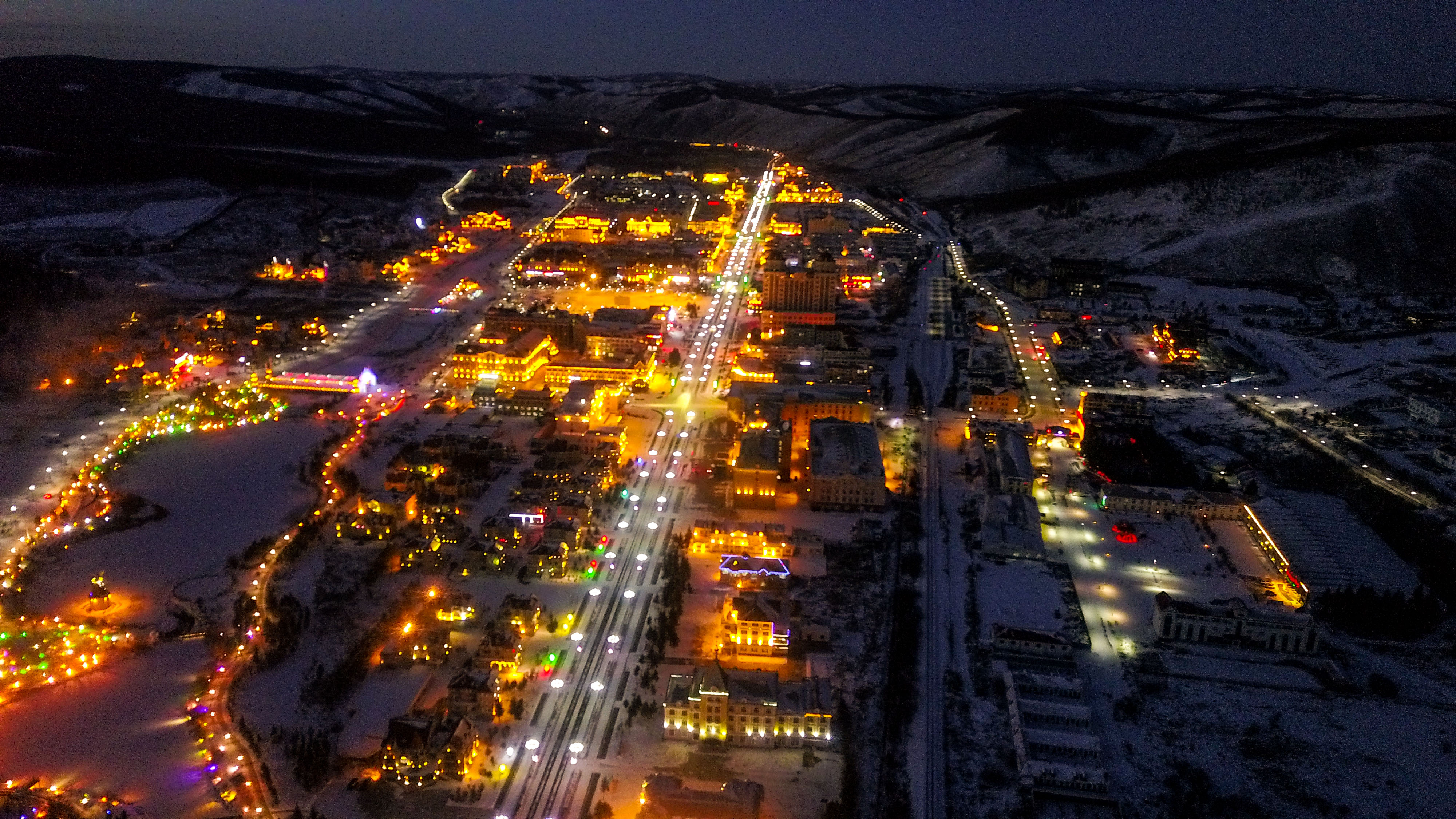Aerial photo taken on Nov. 20, 2019 shows the night urban scenery of Arxan in north China's Inner Mongolia Autonomous Region. (Xinhua/Peng Yuan)