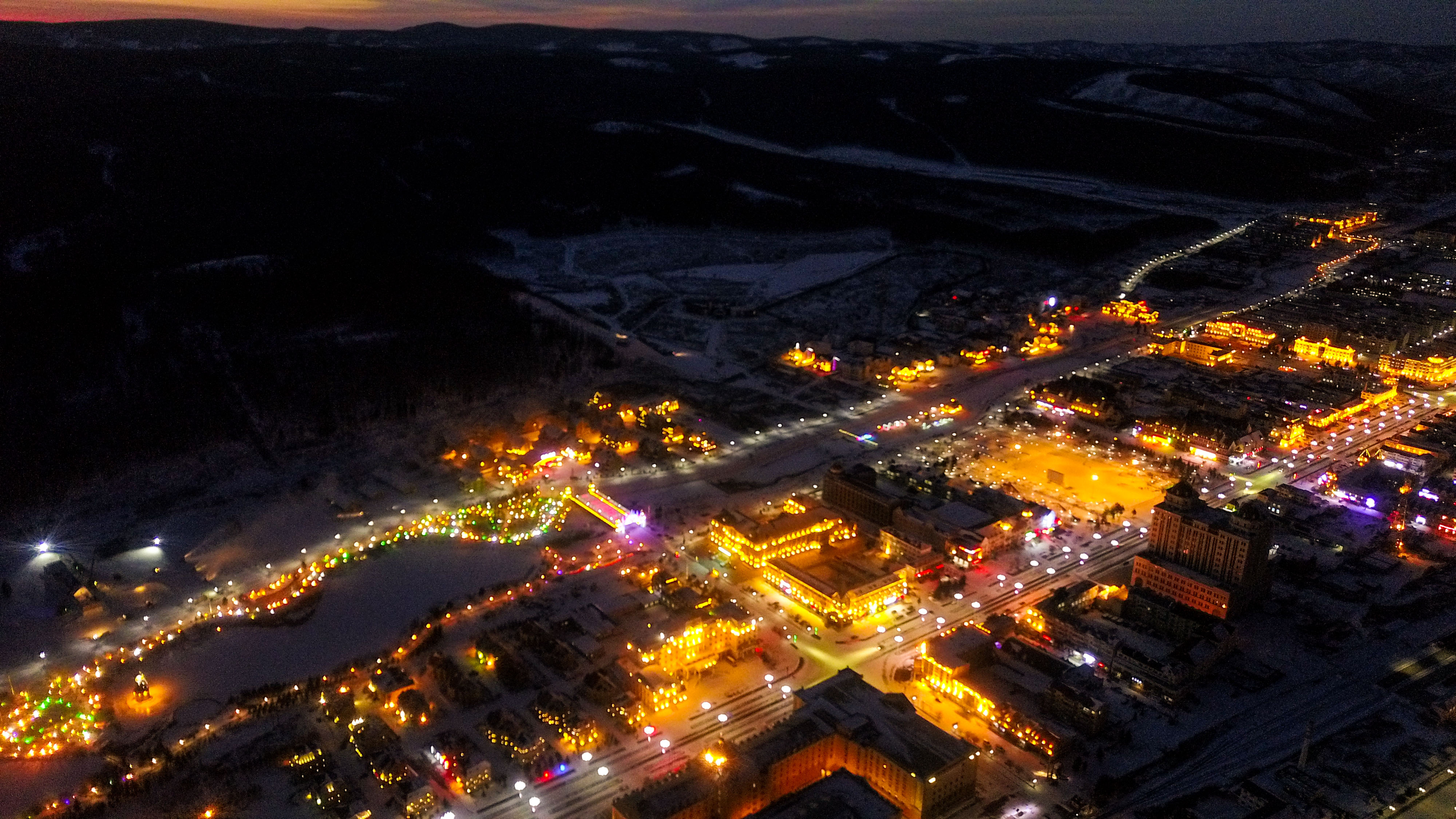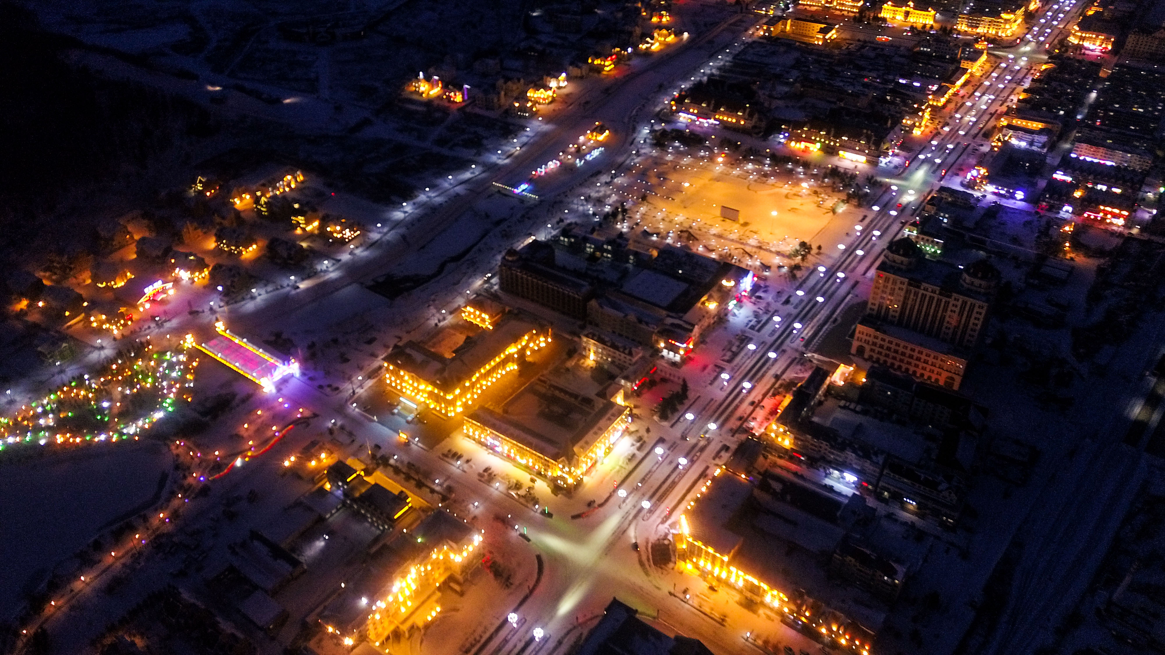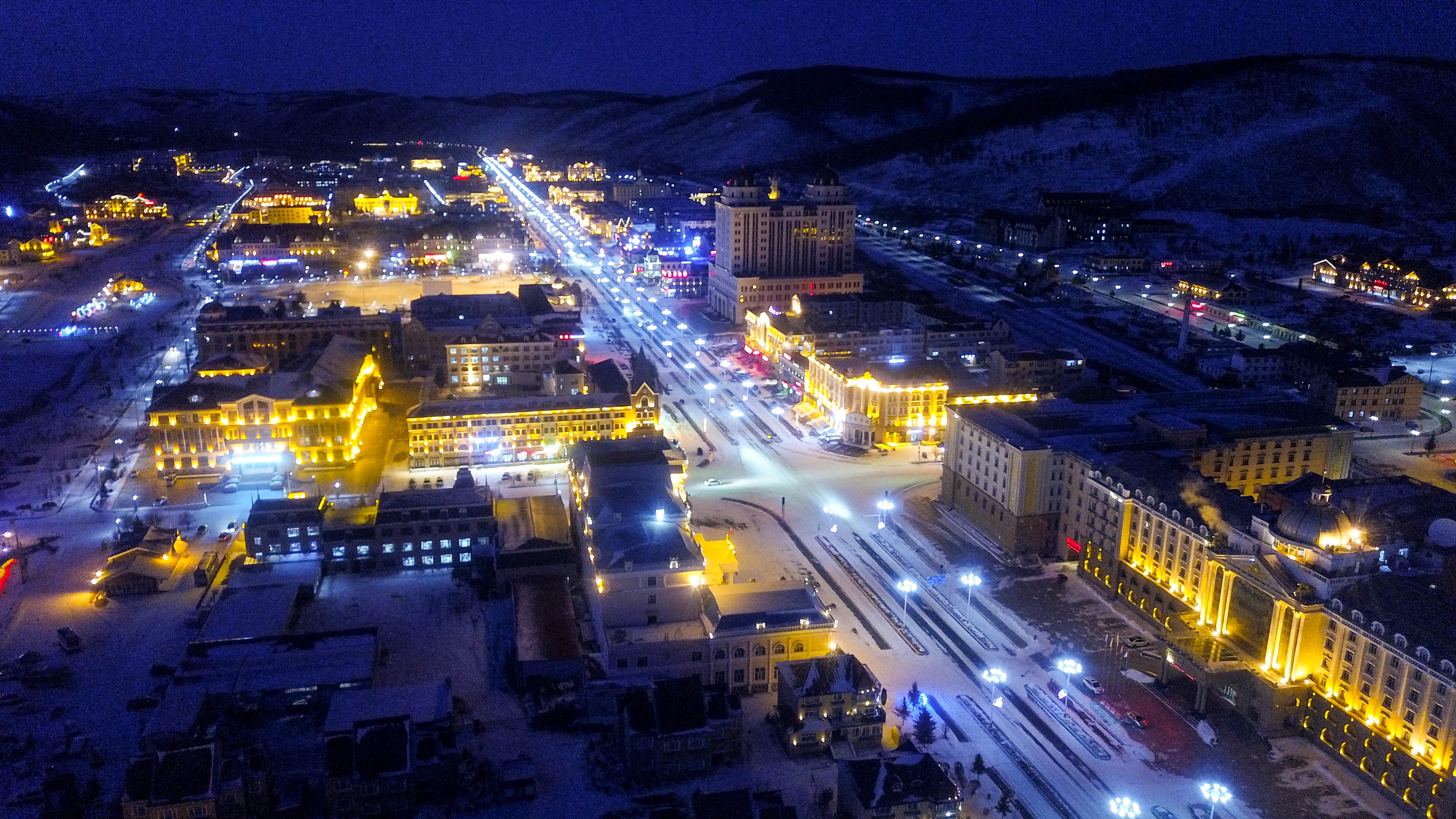 Aerial photo taken on Nov. 20, 2019 shows the night urban scenery of Arxan in north China's Inner Mongolia Autonomous Region. (Xinhua/Peng Yuan)