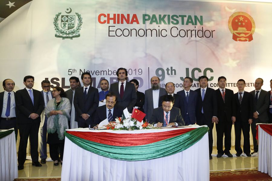 Representatives from China and Pakistan sign cooperation documents during the ninth Joint Cooperation Committee (JCC) meeting of the China-Pakistan Economic Corridor (CPEC) in Islamabad, Pakistan, Nov. 5, 2019. (Xinhua/Ahmad Kamal)