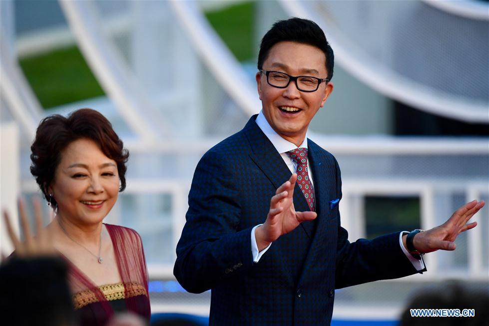 Actor Wu Gang (R) attends a red carpet ceremony of the 28th China Golden Rooster and Hundred Flowers Film Festival in Xiamen, southeast China's Fujian Province, Nov. 23, 2019. (Xinhua/Jiang Kehong)