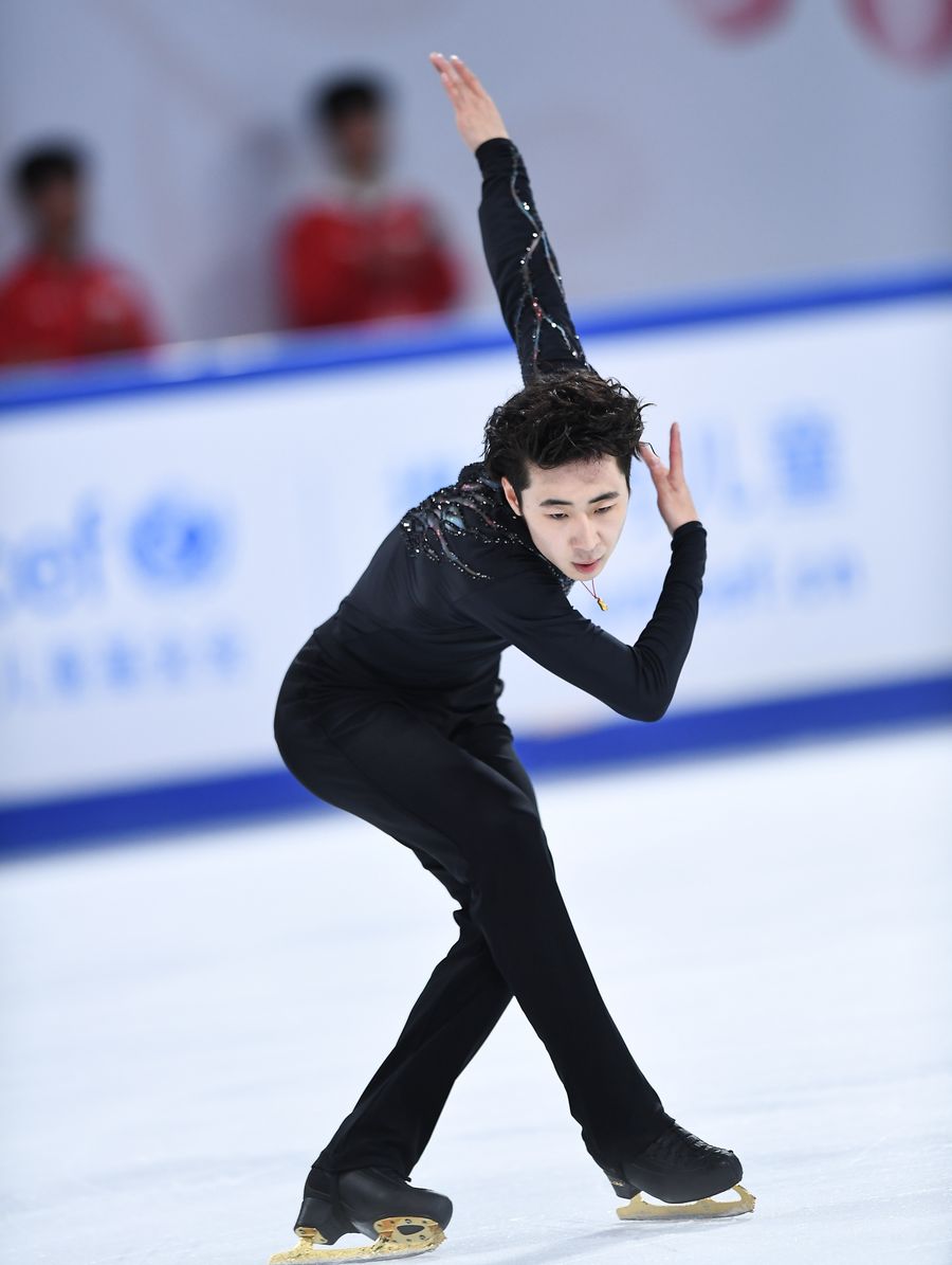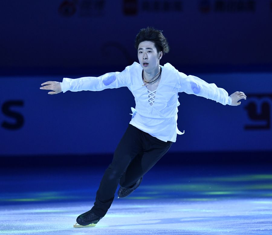 China's Jin Boyang performs during the closing gala of the ISU Grand Prix of Figure Skating Cup of China 2019 in Chongqing, southwest China, Nov. 10, 2019. (Photo by Huang Wei/Xinhua)