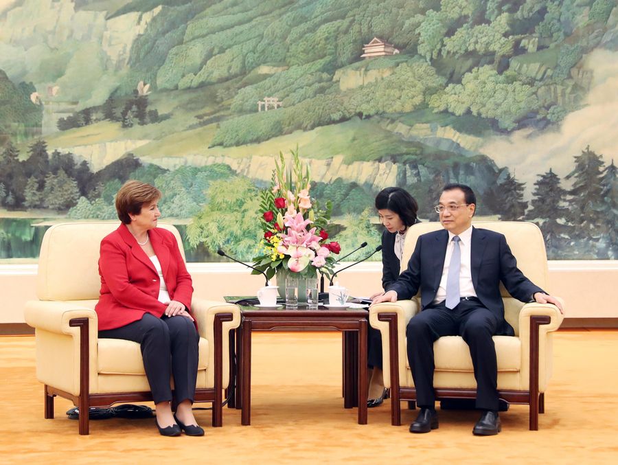 Chinese Premier Li Keqiang meets with International Monetary Fund (IMF) Managing Director Kristalina Georgieva at the Great Hall of the People in Beijing, capital of China, Nov. 22, 2019. (Xinhua/Liu Weibing)