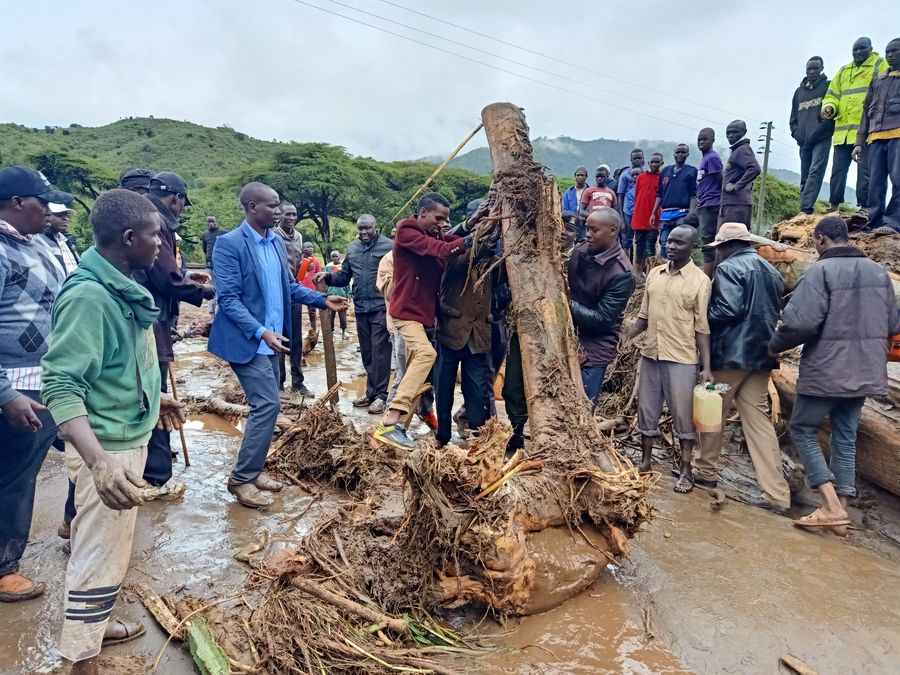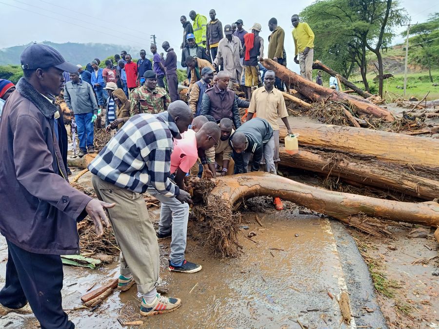 Villagers of West Pokot County join hands to remove the trees destroyed by the landslide in West Pokot County, in northwestern of Kenyan, Nov. 23, 2019. (Xinhua/Robert Manyara)