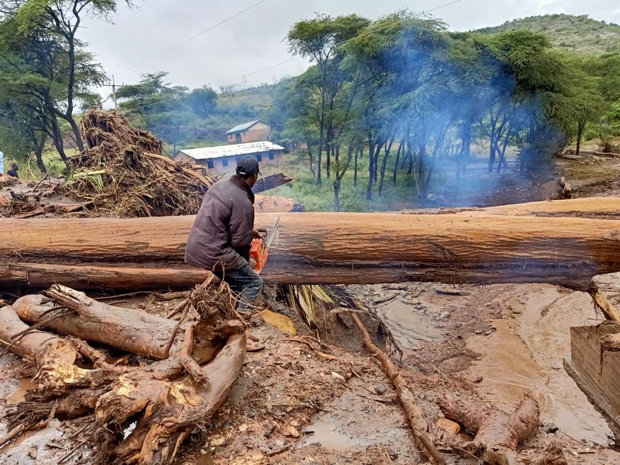 A lumberjack is sawing a big tree that washed down by the landslide in West Pokot County, in northwestern of Kenyan, Nov. 23, 2019. (Xinhua/Robert Manyara)