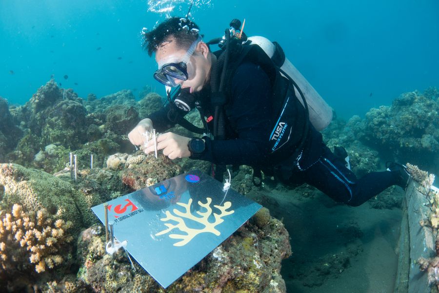 A researcher from Coral Planet, a coral research and protection organization in China, plants corals to frames and coral reefs in Celukan Bawang, Bali, Indonesia, Nov. 25, 2019. (Xinhua/Du Yu)