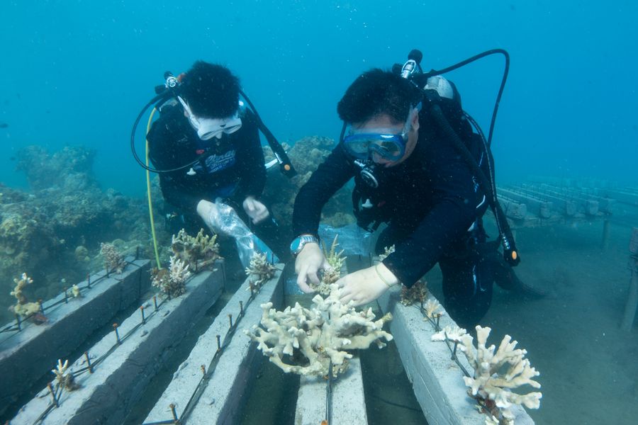 Researchers from Coral Planet, a coral research and protection organization in China, plant corals to frames and coral reefs in Celukan Bawang, Bali, Indonesia, Nov. 25, 2019.(Xinhua/Du Yu)