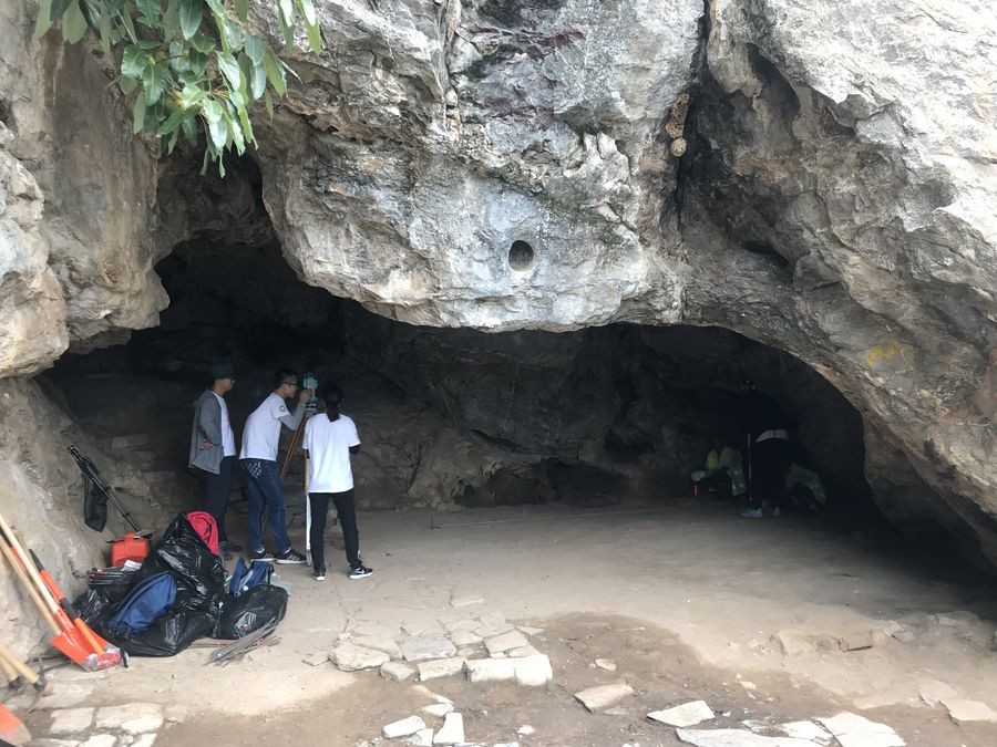 Members of the archaeology team work at the cave site. (Photo provided to Xinhua)