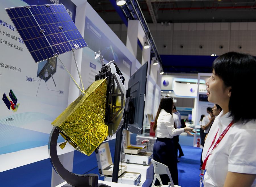 A visitor views a model of Fengyun-4 satellite during the 2019 China International Industry Fair in east China's Shanghai, Sept. 17, 2019. (Xinhua/Zhang Jiansong)