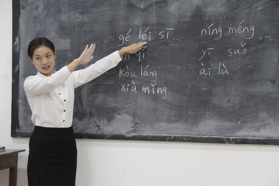 Chinese teacher Wen Pan teaches Pinyin (Mandarin phonetic symbols) at the University of Lome (UL), Togo, Nov. 18, 2019. (Xinhua/Xiao Jiuyang)