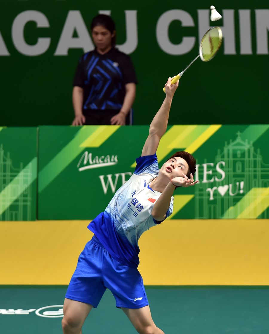 Shi Yuqi of China competes during the men's singles final against Sitthikom Thammasin of Thailand at the 2019 Macau Open badminton tournament in Macau on Nov. 3, 2019. (Xinhua/Lo Ping Fai)