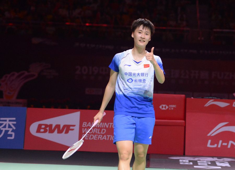Chen Yufei of China reacts during the women's singles final match against Nozomi Okuhara of Japan at the Fuzhou China Open 2019 in Fuzhou on Nov. 10, 2019. (Xinhua/He Canling)