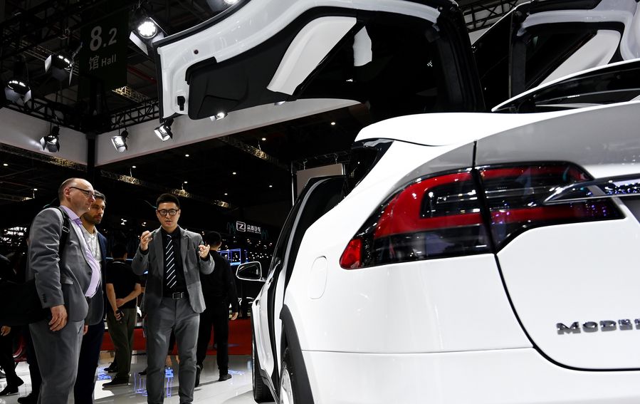 File photo taken on April 17, 2019 shows visitors viewing a Tesla SUV during the 18th Shanghai International Automobile Industry Exhibition in Shanghai, east China. (Xinhua/Fang Zhe)