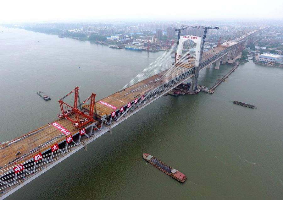 In this aerial photo taken on April 26, 2019, workers finish joining together the steel structures of a rail-road bridge of the Shangqiu-Hefei-Hangzhou high-speed railway over the Yangtze River in Wuhu, east China's Anhui Province. (Xinhua/Liu Junxi)