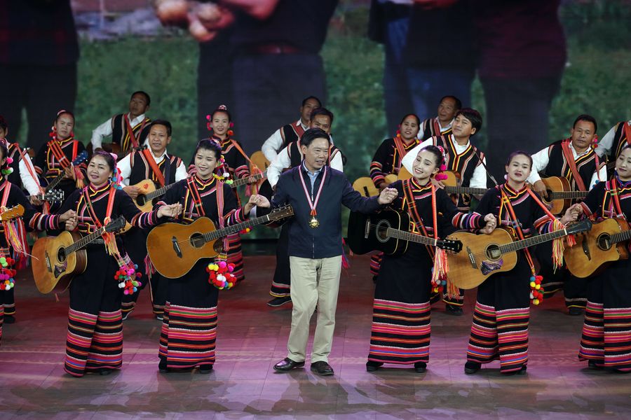 Zhu Youyong (C) dances with villagers from southwest China's Yunnan Province at a ceremony honoring role models in Beijing, on Nov. 29, 2019. (Xinhua/Jin Liangkuai)