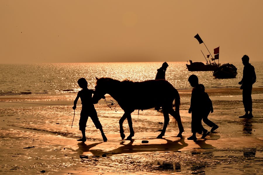 People are silhuoetted at sunset while enjoying horse-riding at Kuakata Sea Beach in Bangladesh's Patuakhali district, some 204 km south of the capital Dhaka, Nov. 29, 2019. (Str/Xinhua)