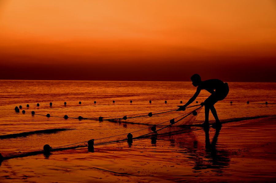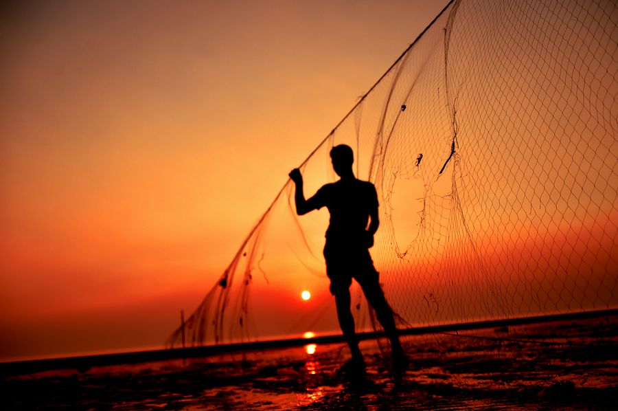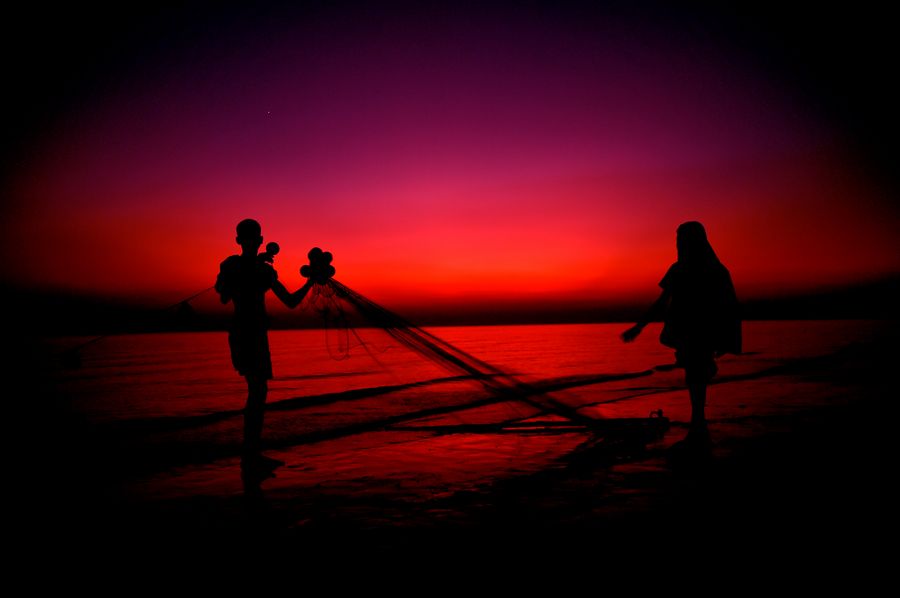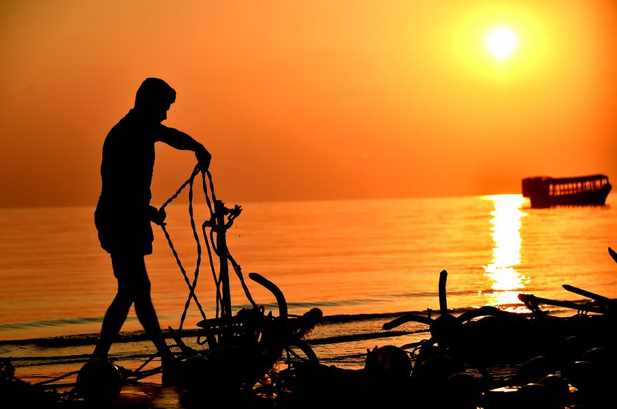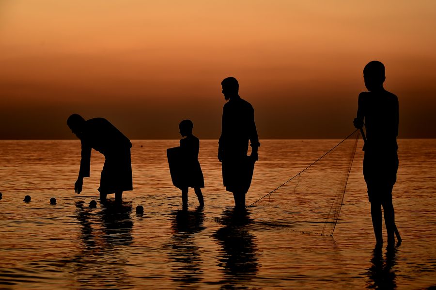 Locals are silhuoetted at sunset while catching fish at Kuakata Sea Beach in Bangladesh's Patuakhali district, some 204 km south of the capital Dhaka, Nov. 30, 2019. (Str/Xinhua)