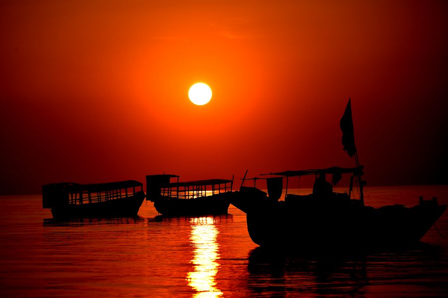 Fishermen are silhuoetted at sunset while catching fish at Kuakata Sea Beach in Bangladesh's Patuakhali district, some 204 km south of the capital Dhaka, Nov. 30, 2019. (Str/Xinhua) ■