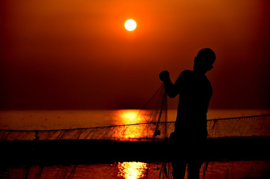 A fisherman is silhuoetted at sunset while catching fish at Kuakata Sea Beach in Bangladesh's Patuakhali district, some 204 km south of the capital Dhaka, Nov. 29, 2019. (Str/Xinhua)