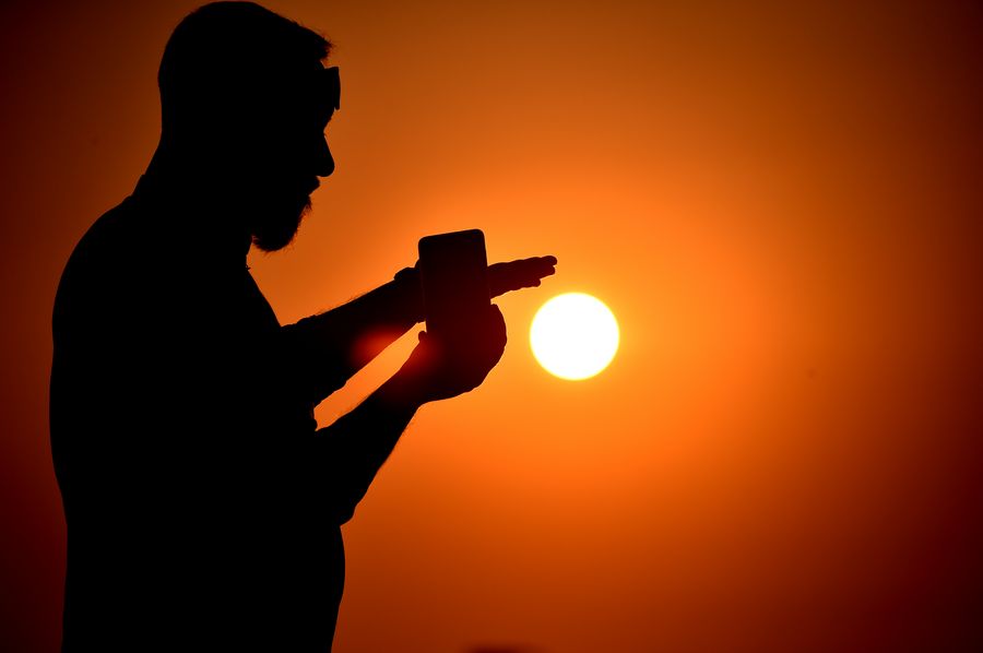 A man is silhuoetted while taking photos of the sunset at a beach of Kuakata in Bangladesh's Patuakhali district, some 204 km south of the capital Dhaka, Nov. 30, 2019. (Str/Xinhua)