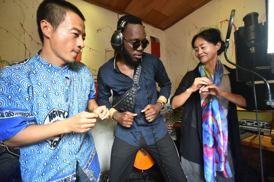 Cameroonian musician Bienvenue Menyou (C), Chinese ophthalmologist Wang Feng (L) and interpreter Jia Fengying record a song at a studio in Yaounde, capital of Cameroon, Oct. 22, 2019. (Jean Pierre Kepseu/Xinhua)