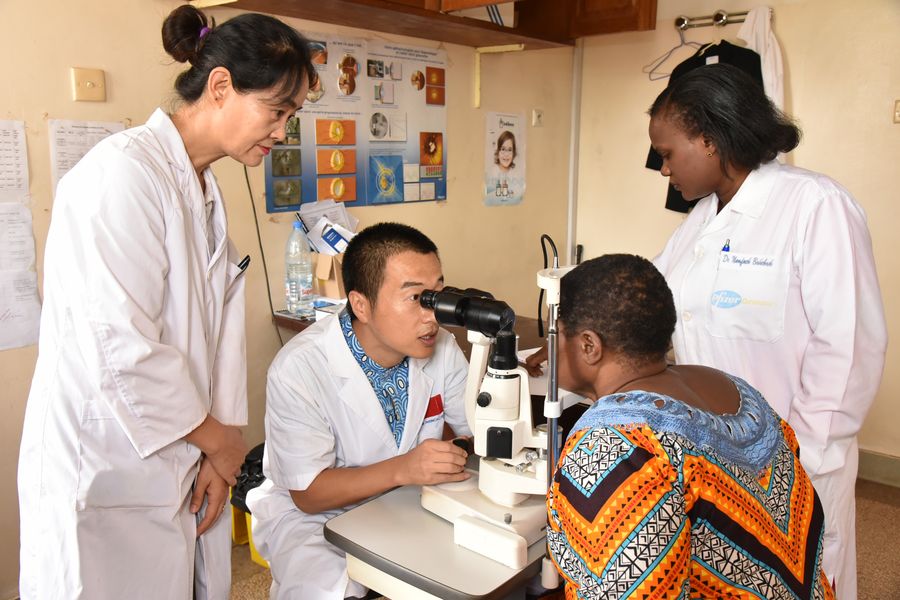 Chinese ophthalmologist Wang Feng (2nd L) and a Cameroonian doctor diagnose, with Jia Fengying (1st L) acting as interpreter, in Yaounde, capital of Cameroon, Oct. 22, 2019. (Jean Pierre Kepseu/Xinhua)