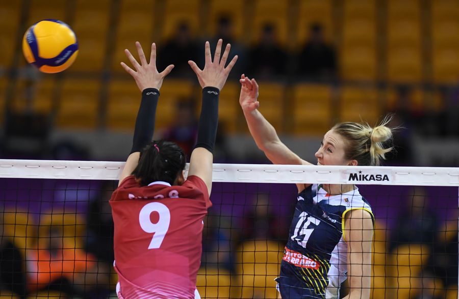 Kimberly Hill (R) of Imoco Volley Conegliano competes during the Pool A match against Guangdong Evergrande of China at the 2019 FIVB Women's Club World Championship in Shaoxing, east China's Zhejiang Province on Dec. 4, 2019. (Xinhua/Li Jundong)