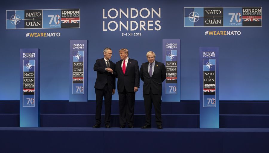 NATO Secretary General Jens Stoltenberg (L), British Prime Minister Boris Johnson (R) welcome U.S. President Donald Trump at the official arrivals for NATO (North Atlantic Treaty Organisation) Summit in London, Britain on Dec. 4, 2019. (Xinhua/Han Yan)