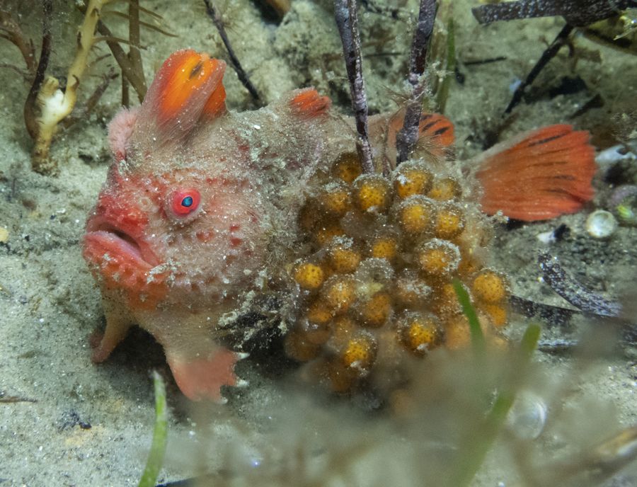 An adult Red handfish with an egg mass. (Photo credit: IMAS)