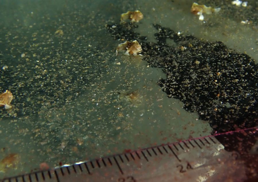 Red handfish hatchlings in an IMAS aquarium, with a ruler showing their size. Photo credit: Jemina Stuart-Smith (Photo credit: IMAS)