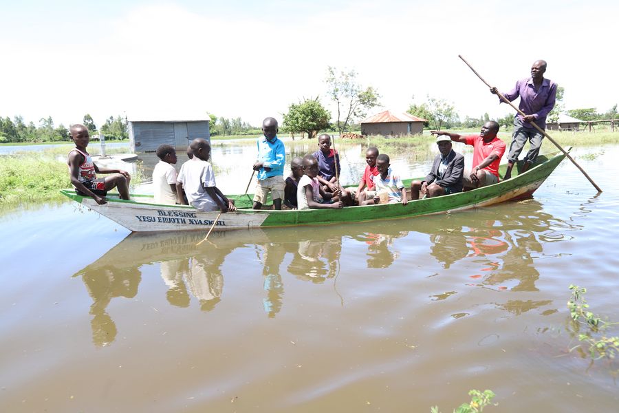 Residents shift to safe places by boat following the ongoing floods in Kakola village in Nyando, Kisumu County, Kenya, Dec. 2, 2019. (Xinhua/Fred Mutune)