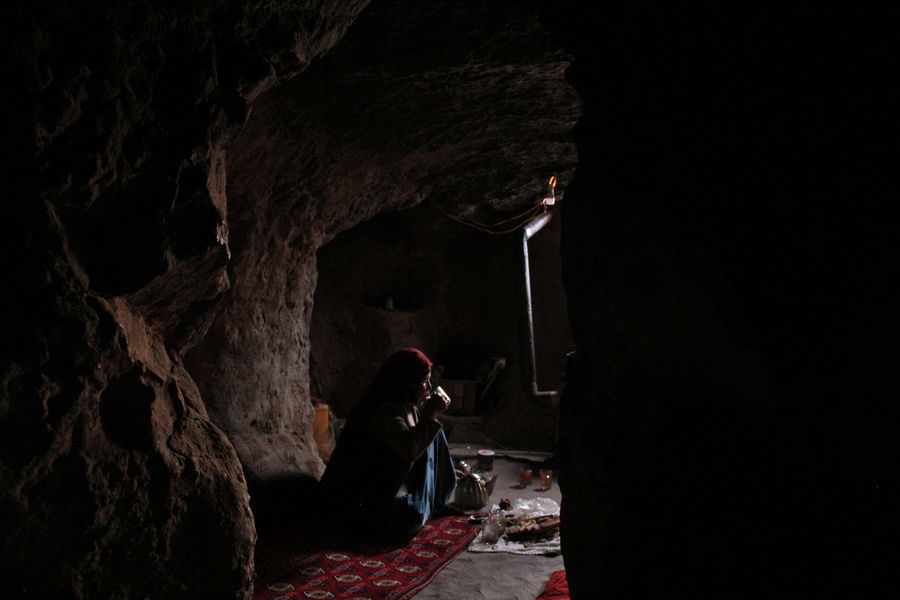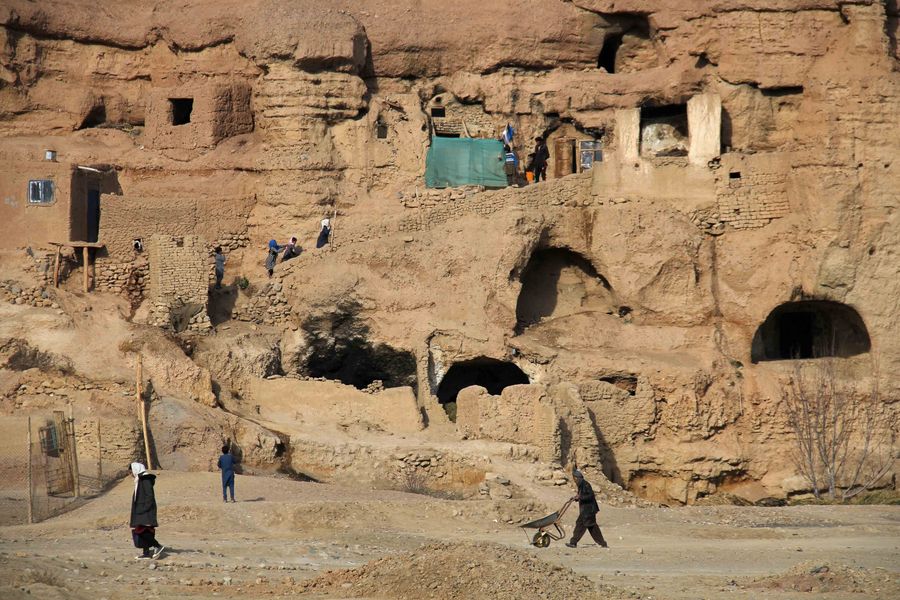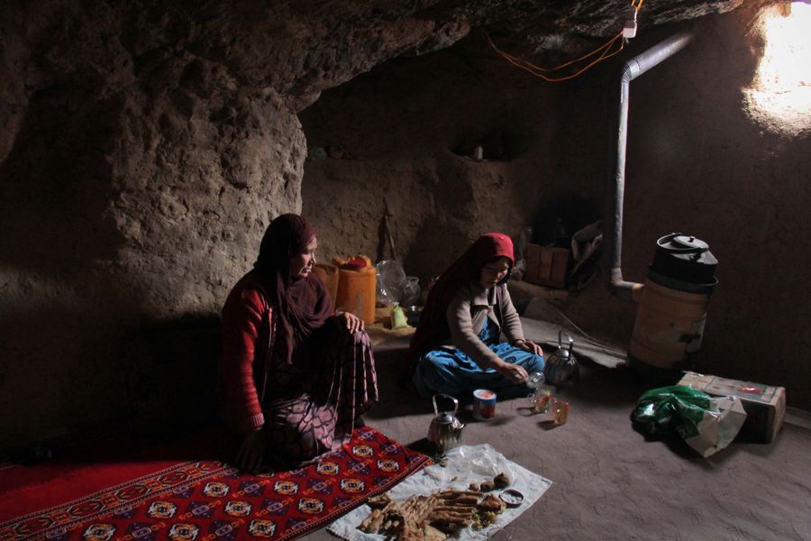 Afghan women are seen inside their cave home in Bamiyan province, Afghanistan, Dec. 4, 2019. (Photo by Noor Azizi/Xinhua)