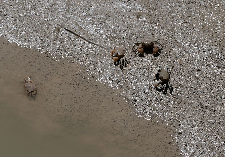 Photo taken on Aug. 10, 2016 shows crabs in Jiuduansha Wetland in Shanghai, east China. (Xinhua/Ding Ting)