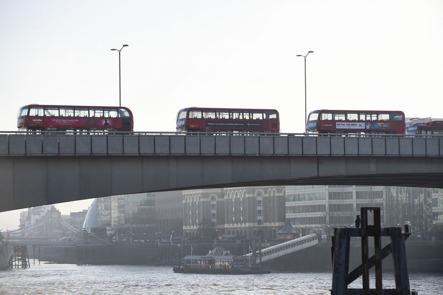 Buses are parked on London Bridge in London, Britain, on Nov. 30, 2019. (Photo by Stephen Chung/Xinhua)