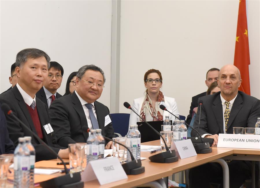 Fu Cong (2nd L, front), director general of the Department of Arms Control of the Chinese Foreign Ministry, attends a meeting of the Joint Comprehensive Plan of Action (JCPOA) Joint Commission in Vienna, Austria, Dec. 6, 2019. Relevant parties reaffirmed their commitment here on Friday to the maintenance and implementation of the JCPOA, commonly known as the Iran nuclear deal. All participants emphasized the importance of full and effective implementation by all sides, as well as their determination to pursue all efforts to preserve the agreement, according to an EU Chair's statement issued following a meeting of the JCPOA Joint Commission held here. (Xinhua/Guo Chen)