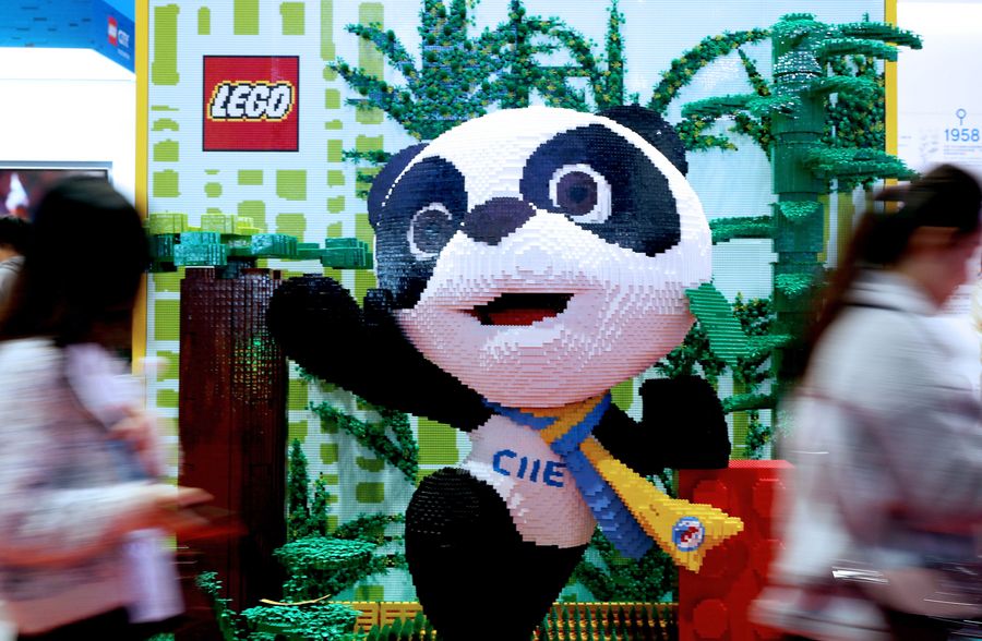 People walk past Jinbo, mascot of the China International Import Expo (CIIE), which is made of Lego bricks, at the Lifestyles exhibition area of the second CIIE in Shanghai, east China, Nov. 9, 2019. (Xinhua/Liu Ying)