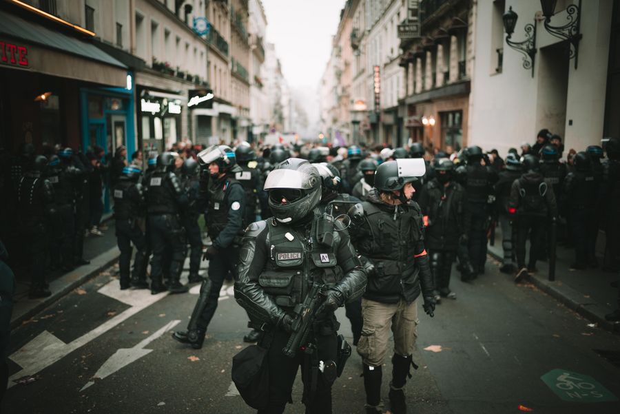 Police officers stand guard during a demonstration in Paris, France. (Photo by Zi Yang/Xinhua)