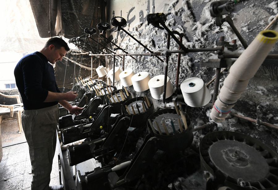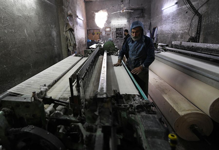 A Syrian man works on a textile machine in the al-Qatarji industrial zone in Aleppo, Syria, Nov. 25, 2019. (Xinhua/ Ammar Safarjalani)