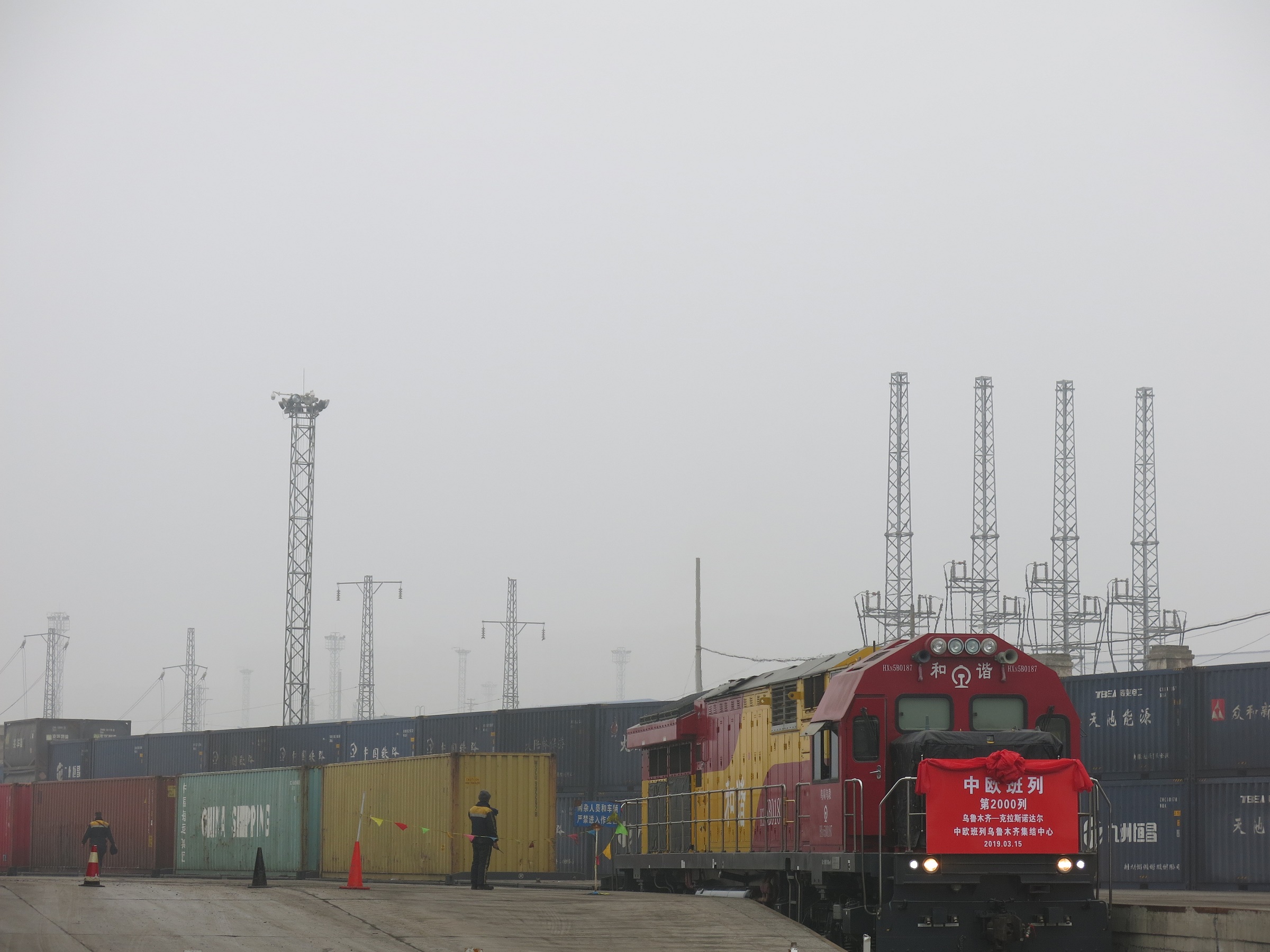 The 2,000th China-Europe freight train heading to Krasnodar of Russia leaves the freight logistics center in Urumqi, capital of northwest China's Xinjiang Uygur Autonomous Region, on March 15, 2019. (Xinhua/Fu Xiaobo)