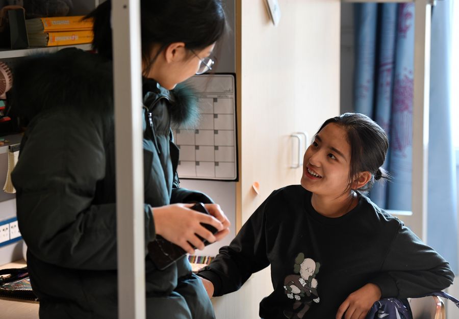 Pubu Droma talks with her roommate in the dormitory on Dec. 6, 2019. (Xinhua/Li Ran)
